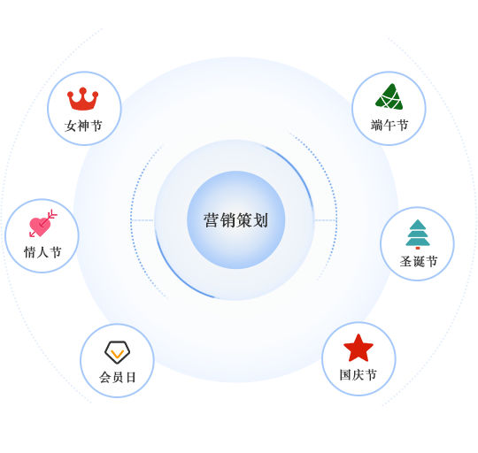 根据活动目标,如新用户激活回馈、节假日营销,活动形式包括节假日活动、电商节庆、会员日,定制周期性活动、热点话题借势营销等,结合线上、线下多种营销形式实现与用户多渠道沟通。
